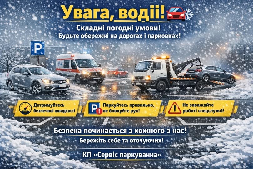 У зв’язку з ускладненням погодних умов (ожеледиця, опади, зниження видимості) КП «Сервіс паркування» просить водіїв бути особливо уважними на дорогах та під час користування паркувальними майданчиками.